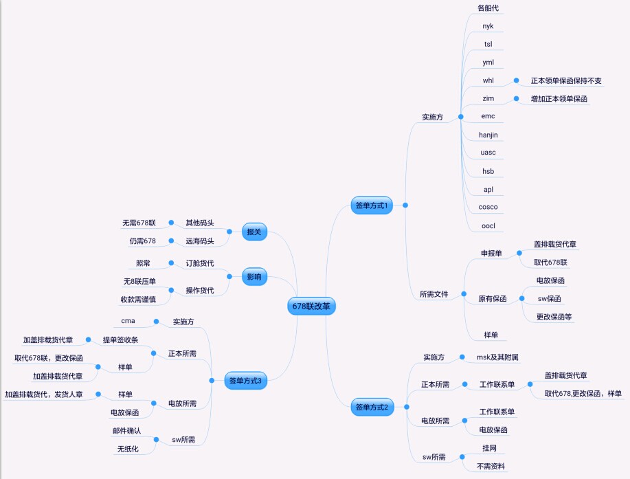 针对以上情况,我司对各大船公司签单流程的更新做了整理,以便大家能够一目了然的快速了解,具体查阅如下思维导图: